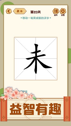 移一笔变新字是一款汉字解谜闯关类游戏,在这里轻松开始解谜,众多不同的闯关玩法,来到这里解开不同的文字谜题,大量关卡可以来到这里尝试,完成更多的谜题,来到移一笔变新字中尝试。