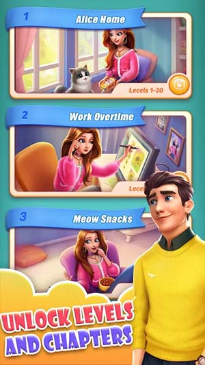 在这里,体验三消关卡即可推动生活剧情,看Alice和小淘气Chris如何应对生活发来的挑战