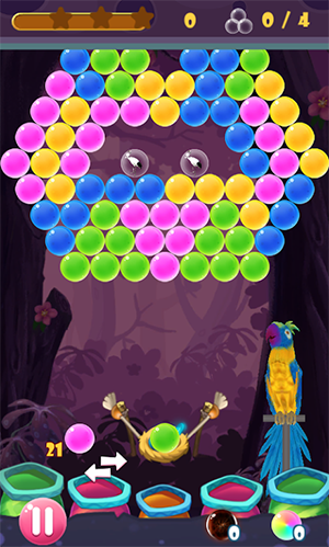 鹦鹉泡泡Parrot Bubble是一款泡泡龙射击消除游戏,有着可爱的鹦鹉、七彩泡泡,美丽的背景音乐等元素。加入游戏,穿越不同主题世界,完成数百个不同级别的泡泡龙消除关卡,使用有用的助推器来完成消除挑战。