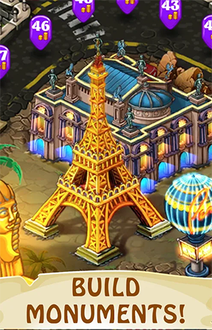 随时使用气球并飞往任何三消城市、解决难题并恢复著名的城市