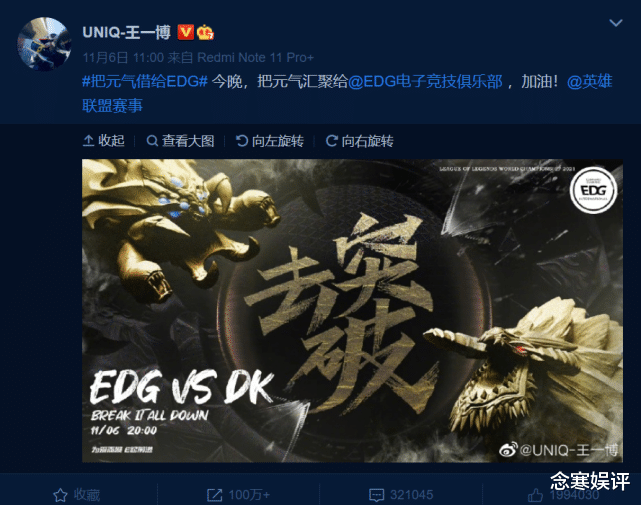 同时,王一博还通过微博发文给EDG加油打气,希望把元气借给EDG,并助力他们勇夺冠军。厉害的是,微博一出没过多久的时间,转发量轻轻松松破了一百万,截止发文的时间,估计两、三百万是跑不掉的。