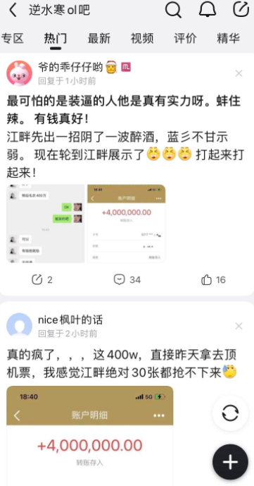 近日,又让逆水寒玩家讨论不休的,就是两位神豪为了准备“天下第一帮”大战怒撒400万现金的惊人之举。原来,逆水寒两位大佬——“蓝杉”的醉酒折花帮会和第一统战“七杀”管理的江畔寻花帮会,这两个帮会为了吸引更多高战力玩家加入自己团队,纷纷出高价抢人,这过程只见钞票在纷飞,十分炫目!