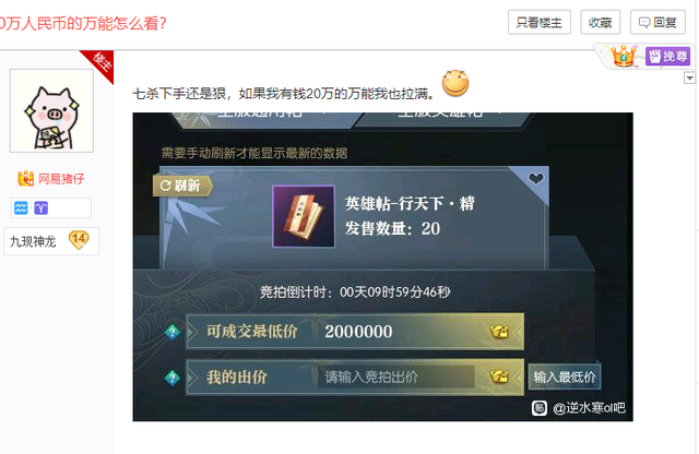 目前市面上土豪玩家最多的网络游戏,当属网易的古风网游《逆水寒》,这款游戏因为画面精美江湖设定细腻,一上市就吸引了诸多土豪大佬的关注,而愿意在游戏中大笔花钱的土豪玩家,无不是自视甚高的性格,而如果土豪们为了争一口气,往往会出现令普通人刷新三观的“冲动”行为。近日,《逆水寒》玩家们讨论最多的,就是游戏中顶级土豪一夜之间怒冲400万参与抢人大战的戏码。