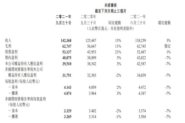 11月10日,腾讯公布第三季度业绩报告。报告显示,腾讯第三季度营业收入为人民币1423.68亿元,同比增长13%;归母净利润为人民币395.1亿元,同比增长3%。