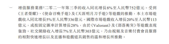 此外,腾讯还将游戏业务拆分为本土和国际两个市场分别披露:本土市场游戏收入为人民币336亿元,同比和环比均增长5%;国际市场游戏收入为人民币113亿元,同比增长20%(以固定汇率计算则为28%),环比增长4%。