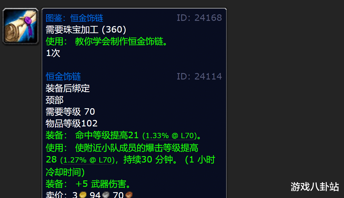 恒金饰链这个饰品的话我并不想就进行过多的评价,要想获得该件饰品一般要先发现恒金饰链的图鉴,该图鉴一般可以去拍卖行进行购买,价格也相对来说比较波动,虽然说属于70级的装备,但是目前的价格还是偏低,但是依旧不推荐玩家们去入手,可能随便一个野外的小怪或者是一些小团本掉落的饰品价格都很高,如果你想去打团本副本的话,那么这个饰品的价值就比较大了。