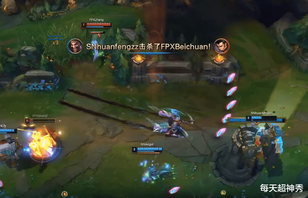 当己方两路高地水晶被击破,慢热的SN众将终于找到了些许比赛的感觉,不只Bin凯南多次开出完美大招,火力全开的Huanfeng德莱文更是连续收割残局,带队稳住阵脚,另一边FPX找到机会推掉SN两座门牙塔和上路高地水晶,进一步扩大兵线优势。