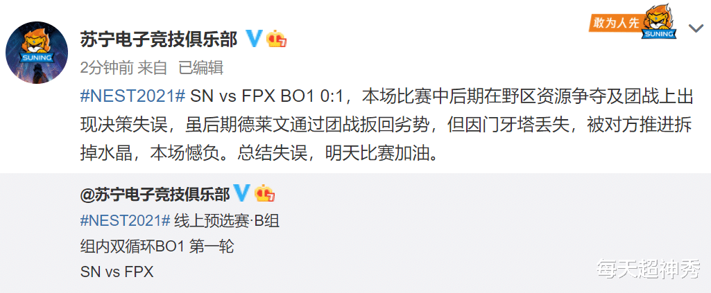 爆冷不敌FPX二队,SN官博亲自发文安慰观众:SN输掉了小组赛首战,前中期决策出错,后期依靠Huanfeng德莱文扳回劣势,但门牙塔失守,FPX强行一波结束比赛,我们会认真总结失败,接下来的比赛继续加油!