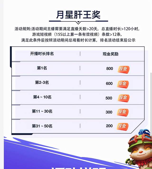 为了能够更直观地让参加活动的玩家们,感受到快手直播的诚意,快手特意开出了三个奖项,分别是人气更新奖,直播天数大于20天,游戏时长大于120小时,游戏短视频大于12个,就可以参加活动的排名,第一名可以获得1000元的现金奖励。周星肝王奖则是在一周内直播最长的主播可以获得500元的现金奖励,月星肝王奖则是一个月最高时长的主播,可以获得800元奖励。