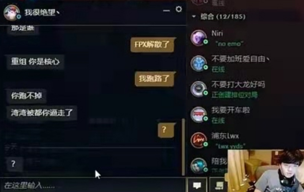FPX止步小组赛后,回国隔离的Lwx在首次直播就彰显了“大聪明”本色,和友人聊天FPX的重组计划。其中友人说Lwx是重组核心,Lwx表示“FPX解散了,我跑路了。”由于这是在直播过程中,因此当时我还以为这是Lwx的整活。