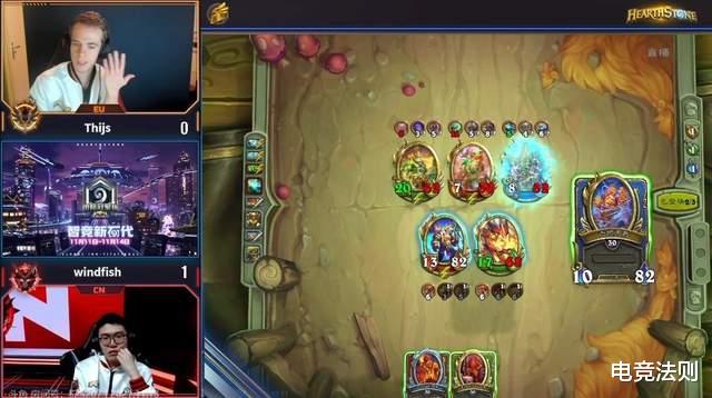 第二小局,风鱼火菠萝对阵太子自然剑圣。太子开局想秒晨拥,结果拼速失败,不仅被晨拥打出群体减速,还被晨拥亡语准确地冻住了关键佣兵布鲁坎。之后,风鱼预判了太子的预判,打出大菠萝却没有使用火焰践踏,而是秒掉了太子的自然流提速核心玛法里奥,紧跟着大菠萝开始输出,又接连秒掉布鲁坎和剑圣。最终,风鱼凭借火菠萝的多核输出拿下了这一局。