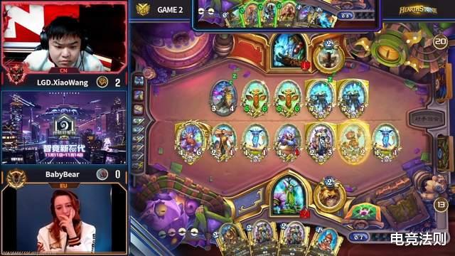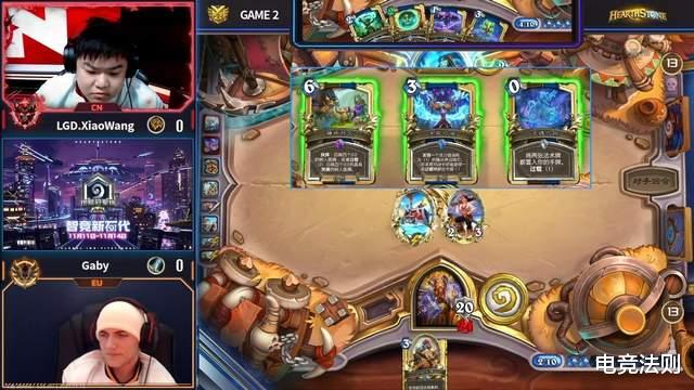 第三小局,小王爷对上了上一场比赛中发挥出色实现逆转的Babybear的快攻德。小王爷在8费时的一波细节操作,用多系施法者成功抽到了充能召唤,召唤出了两个废料场魔像,28血的“叹息之墙”,快攻德倾全场之力也过不去,比赛已经没有悬念。