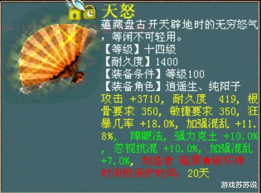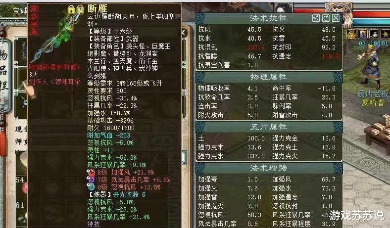 最后咱们来聊聊关于人族法术炼化的属性,现在的版本里大家都比较注重忽视属性,但不要忘记拥有忽视10的基础上依然可以继续出现强法属性,这把当年的14级武器就是如此!不夸张地说,那时候图中这件装备的价值甚至不逊色4阶仙器,当然每次提及这个话题时,总会有人询问那件忽视10强混13的武器到底是真是假,由于年代久远小苏无法确定当年的情况,但是按照《大话西游2》的炼化规则来衡量的话,在拥有忽视10之后,强混7就已经是天花板级别的水平了。