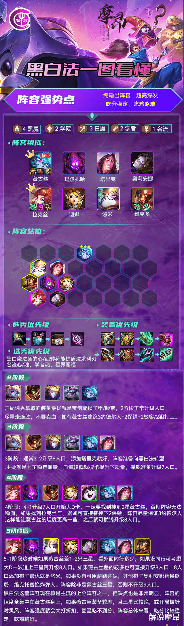 这次更新对上版本强势阵容影响最小得就是黑白法,测试中符能护盾虽说只有8秒,但薇古丝得护盾变得更厚了坦度大大提升,能抗得时间更持久,能给后排输出争取到更多得输出时间,拉克丝、维克托一套技能就能让敌方大部分棋子残血,脆皮直接被秒。这套阵容前三率仅次于学院卡特。