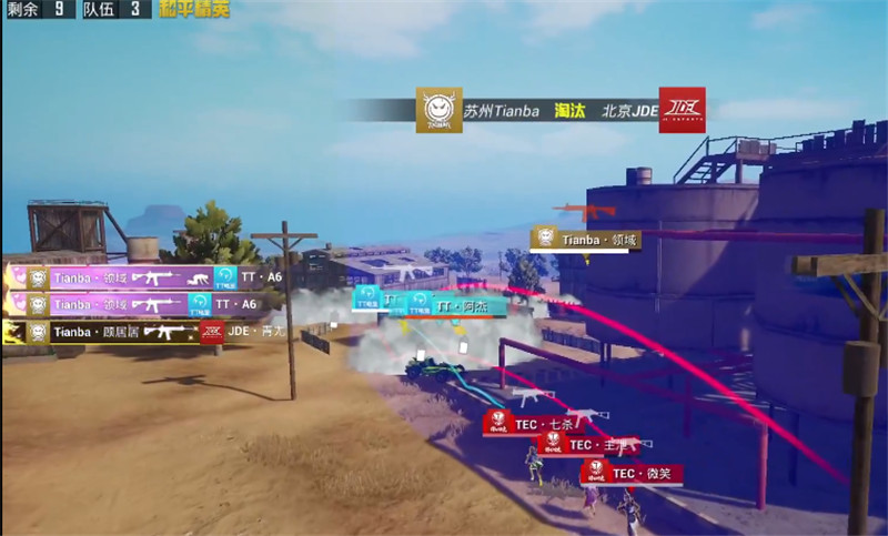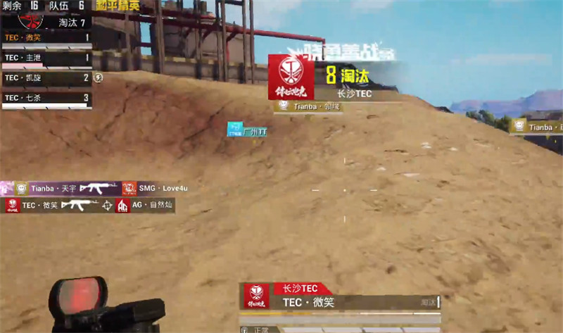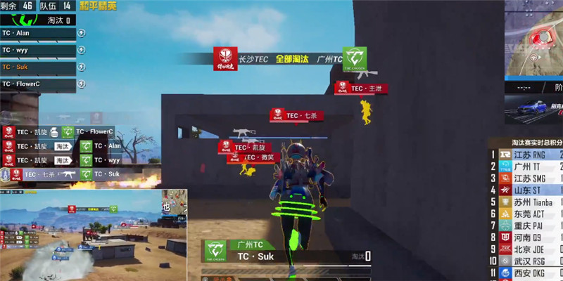 圈四阶段,此时TEC正好在圈边位置的房区,正好最近势头正盛的广州TC前来冲击房区,对方可是来势汹汹,万万没想到TEC丝毫不怂,拉开枪线配合防守,电光石火间七杀先下一城把TC花痴淘汰,确保了人数上的优势,再加上远处有TT枪线“劝架”,一时间双方打得难分难舍。