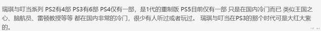 有玩家表示“瑞奇与叮当系列 PS2有4部 PS3有6部 PS4仅有一部,是1代的重制版 PS5目前仅有一部 只是在国内冷门而已 类似王国之心、脑航员、雷顿教授等等 都在国内非常的冷门,很少有人听过或者玩过。 瑞琪与叮当在PS3的那个时代可是大红大紫的。”