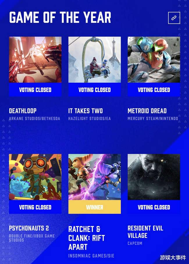距离年度的游戏大奖TGA的最后奖项发布已经越来越近,不知道你心目中的年度最佳游戏是哪一部呢?前不久TGA公布了获得年度游戏提名的几款游戏,最近国外知名论坛Resetera 上的一位网友表示,TGA 2021年度游戏大奖的获得者可能已经泄露了。《瑞奇和叮当》是今年的TGA大奖获得者。这位网友表示在进入The Game Awards网站的时候显示投票已经结束,而《瑞奇与叮当》是获胜者,并且还展示了当时自己留下的截图。一起来看看详情吧!