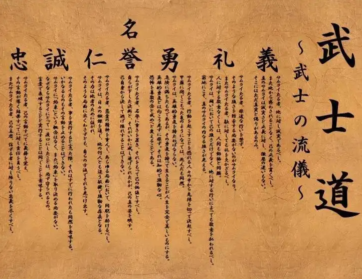 武士道,是日本封建社会中武士阶层精神支柱。起源于日本镰仓幕府,后经江户时代吸收儒家和佛家的思想而形成。武士道精神最典型的行为是切腹。倡导一些美德如:义、勇、仁、礼、诚、名誉、忠义、克己。