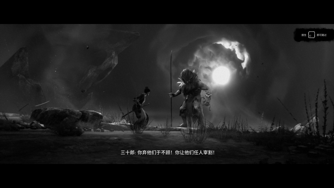 整个游戏呈现黑白复古风格,从一进入主界面起,悠扬的琴声就透露着孤寂与伤感,也暗示着玩家将迎接一场腥风血雨的挑战,游戏内的场景多以乡村与树林为主,玩家的视角采取了特定的摄像机角度,角色的画面比例也相对较小,再搭配了固定的运镜效果后,给人感觉就像在看黑白武士电影的感觉。场景画面从亮到暗的过度也有着非常丰富的层次感,还加入了老式胶片机的噪点和画面屏闪特效。