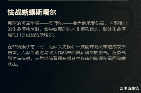 克烈出了名的假血条,一管血打下马,不在3秒内打死本体,马上又能上马。一下一上半条血又回来了,特别是会玩的克烈玩家,能把“怯战蜥蜴斯嘎尔”这个被动发挥到极致,让人都不知道该不该打。