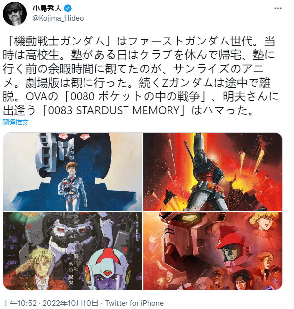 小岛先生还发推表示自己看第一步高达作品时还在高中,以及关于其他高达作品的回忆。