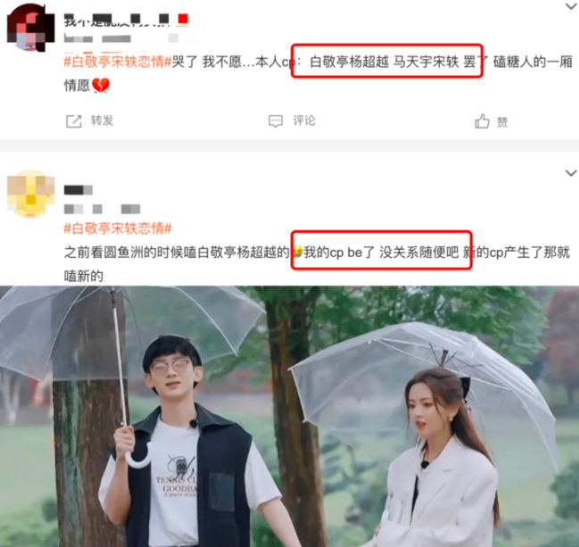 白敬亭疑似和宋轶的恋情曝光后,也有许多嗑他和杨超越cp的网友纷纷大喊无法接受。据了解,白敬亭和杨超越在综艺节目《登录圆鱼洲》因为各种亲密举动被猜测私下已经恋爱。比如杨超越快摔倒时,一向高冷的他主动去搀扶,对待别的女星便是“这是另外的价格”。白敬亭说怕蜘蛛时,还会主动往杨超越身上靠,喜欢嗑糖的网友疯狂在两人身上找恋情实锤的蛛丝马迹。
