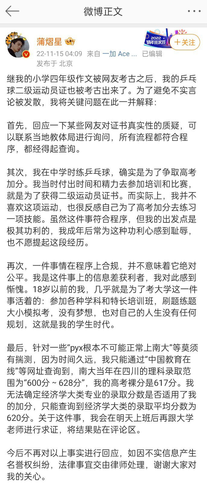 15日凌晨,@蒲熠星 发长文回应自己的乒乓球二级运动员证,表示“确实是为了争取高考加分”,“虽然这件事符合程序,但我的出发点是极其功利的,我成年后常为这种功利心感到耻辱。”