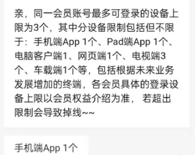 客服回应表示目前同一会员账号最多可登录的设备为三个,同时可登录两个设备,手机端APP只能登录一个。