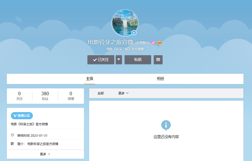 铃芽之旅是新城海的新作电影,此前已经在日本播出好评如潮,最近官方在微博开通账号,下面小编为大家带来铃芽之旅开通官微介绍,感兴趣的小伙伴一起了解一下吧。