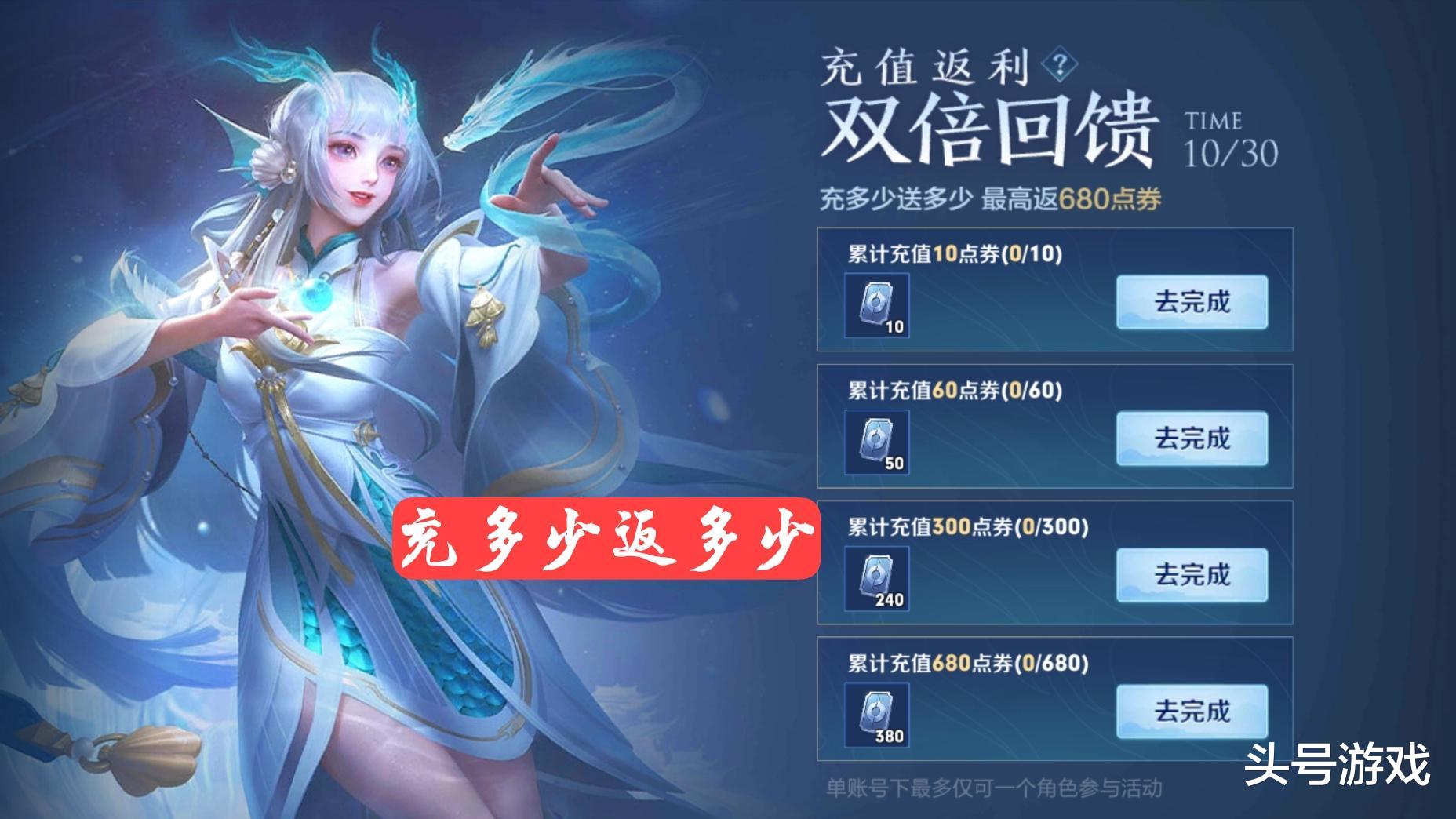 还有一种方法,那就是利用王者荣耀的活动,王者荣耀在这一次版本更新之后,上线了一个充值返利的活动,这个充值返利和以往的时候有些不太一样,因为可以让我们充多少点券就要送多少点券,比如说我们充680点券就可以额外再得到680点券,总共可以拿到1360点券,可能有些小伙伴比较疑惑,这些点券也不够一款传说皮肤的价格呀!