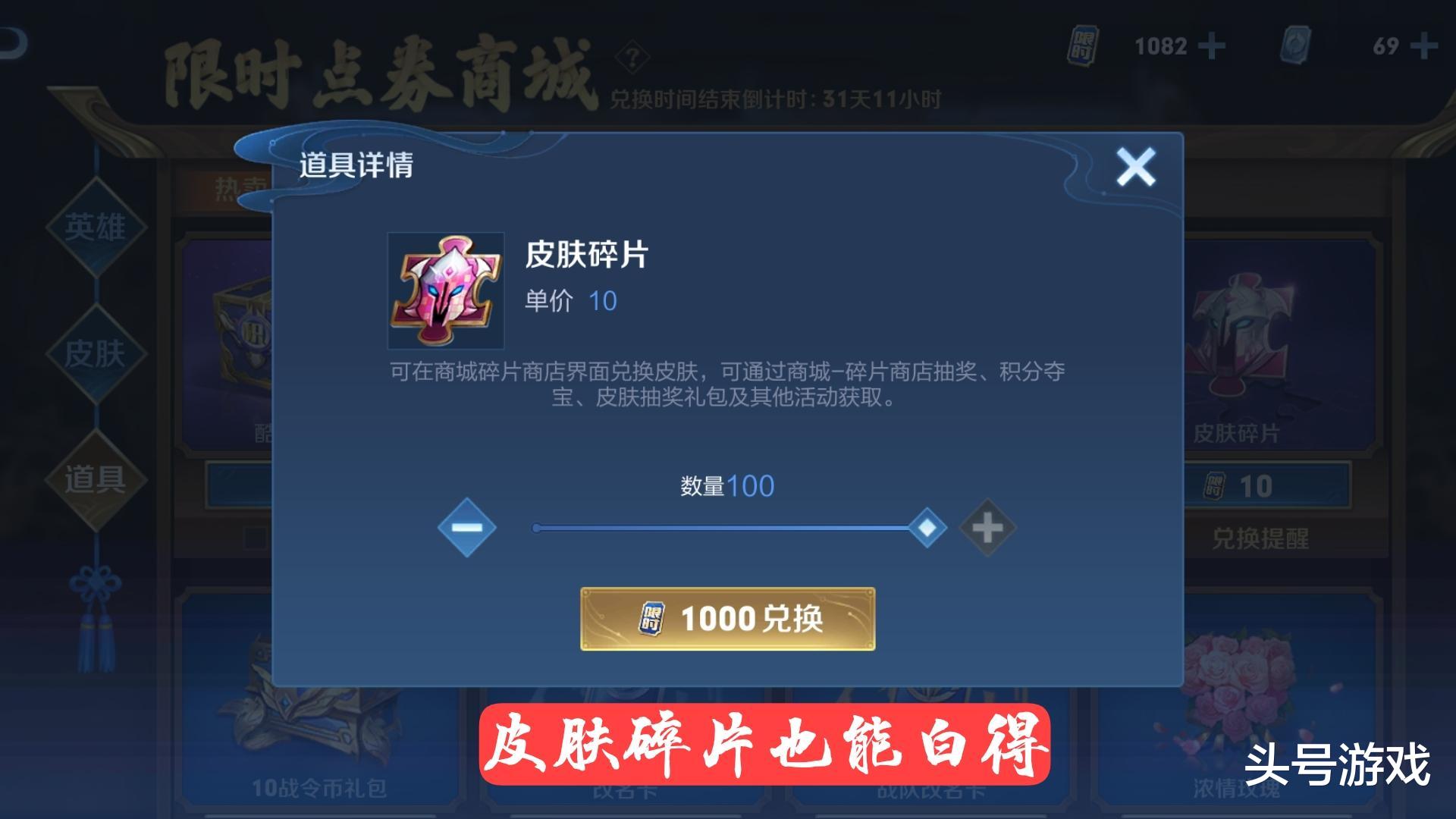 那就是这一段时间王者荣耀给大家赠送了很多的限时点券,如果我们把所有的小号也全部领取1800个限时点券,那么在商城中就可以兑换到100个皮肤碎片,然后把小号和自己的大号进入一个战队,再以皮肤碎片红包的形式发出去,这样就可以把所有的皮肤碎片转移到自己的大号上,这样的话自己就可以在碎片商店中兑换很多的永久皮肤了,你们学会了吗?