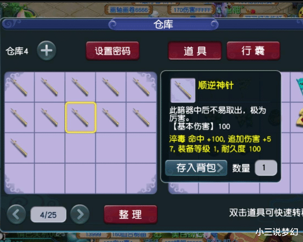 上面的这位玩家想知道自己仓库中的这个暗器值钱吗?这个暗器增加了57点伤害,还有淬毒的效果,这种暗器非常值钱,应该死一两千万级别的东西,但是这种暗器也很难卖,因为这样的暗器都不是普通玩家能够拥有的,只有某些喜欢打PK的高端女儿村会使用,而且使用的频率很低,一个暗器能够用好久。