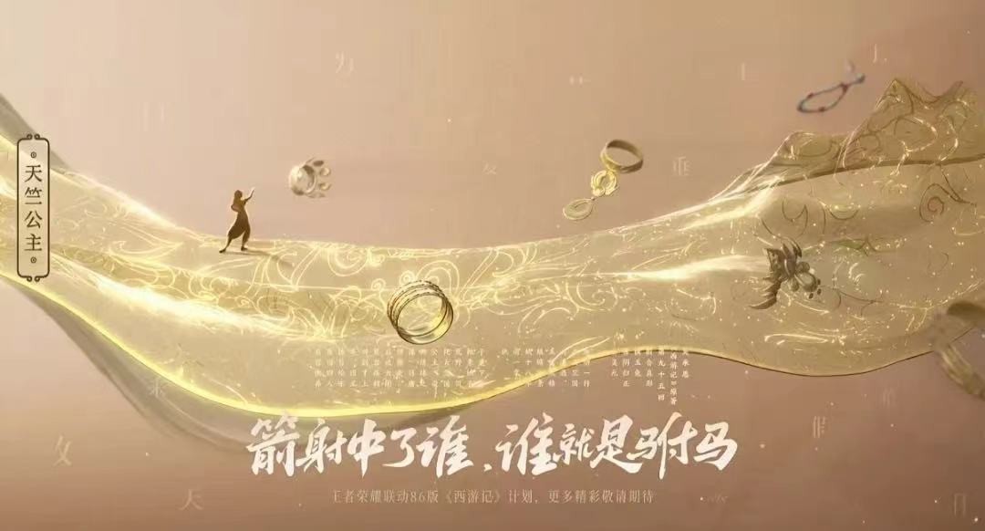 第二款公布的皮肤是天竺公主,虽然曝光的宣传图中并没有天竺公主的造型设计,但是从图中可以看到“箭射中了谁,谁就是驸马”的台词,相信所有熟悉西游记剧情的小伙伴都可以猜到是玉兔精变化的天竺公主,不过这款皮肤目前还不确定归属哪位英雄。