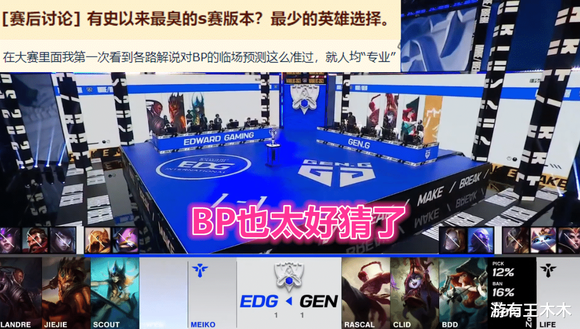 解说预测精准不一定是他游戏理解高,毕竟这次世界赛英雄池已经被设计师搅烂了,能上场的英雄屈指可数,BP非常好猜!比如红色方永远要禁用妖姬卡牌,剩下的几个世界赛常客都看腻了,中路法师快把BAN位占满了。