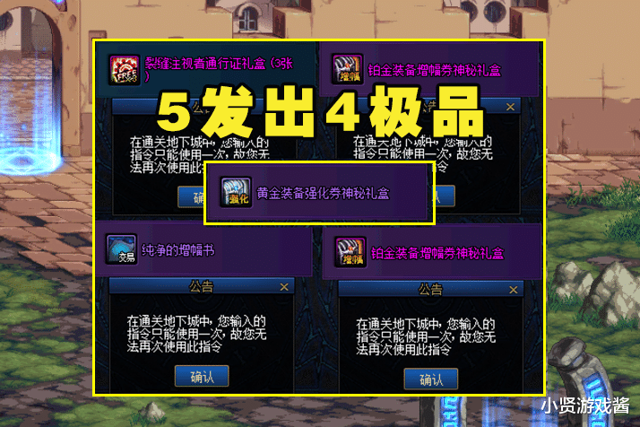 而在获得5个龙盒之后,也是有不少玩家在各大贴吧。论坛直播开盒子了!其中大部分玩家都是以复活币、契约、强化器等蛇皮道具收场,非常的科学。但是却有一位欧皇玩家却吸引了无数玩家的道具,在5发龙盒中,就有4发道具非常的极品,分别是2个铂金装备增幅券神秘礼盒、黄金装备强化券神秘礼盒、纯净的增幅书道具,简直不要太欧,这不禁让人怀疑这是策划请来的狗托吧!