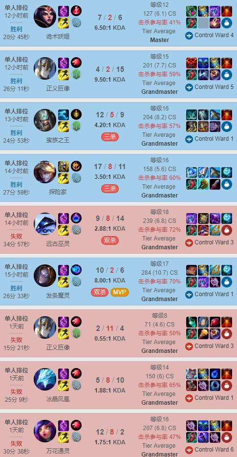 自半决赛结束以来,许秀的Rank量真的很大,这里只截取了最近18场的记录。英雄选择也可谓是百花齐放,妖姬、加里奥、蛮王、泽拉斯、发条、冰鸟、妮蔻、卢锡安、库奇等等。