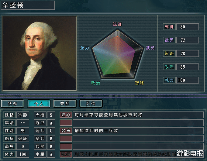 华盛顿的能力值总体在 80 左右,但初始魅力却高达 98,这与他二阶的特技名声,相得益彰在征兵的时候有着非常好的效果。不过智力却与归心的搭配程度则有点低,此前我们介绍过特技归心,就是伯乐的效果,既然是伯乐的效果,那么就有很大的概率在找到武将之后触发舌战,而华盛顿的智力只有 76,性格也是相对在舌战中较弱的冷静,使得华盛顿在舌战中没有什么必胜的把握,所以归心与能力值的搭配相性则较低。