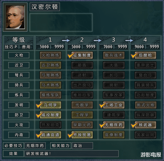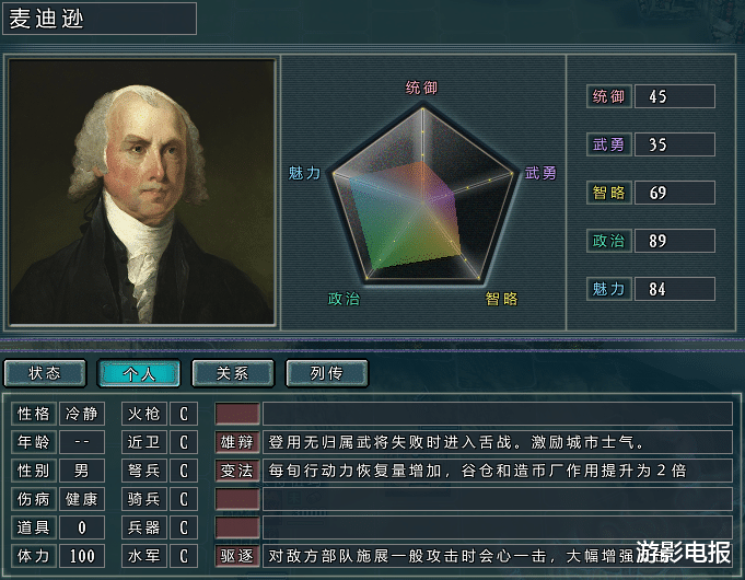 我们一直在强调,美国势力的这些武将都很均衡全面,所以这些以内政出名的武将,在其他方面也有不小的能力,我们再看一下另外比较有代表性的武将麦迪逊。