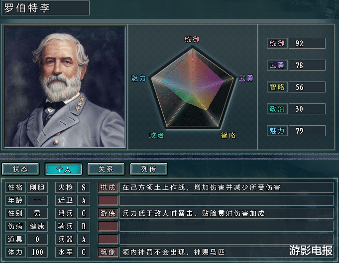 从罗伯特李的设定上我们也很容易看出,他是一名战场上典型的“打手”设定,高达 92 的统率和 78 的武力,让罗伯特李在战场上的攻防能力都不会太弱,再加上有火枪适性的 S 等级,俨然一副美国势力第一武将的范就起来了。