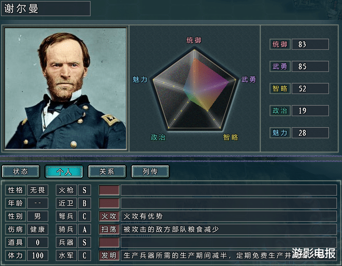 像罗伯特李这样情况的武将在美帝阵营中比比皆是,我们也不一一细说了,重点说说我们要努力培养的一名隐藏大神谢尔曼。