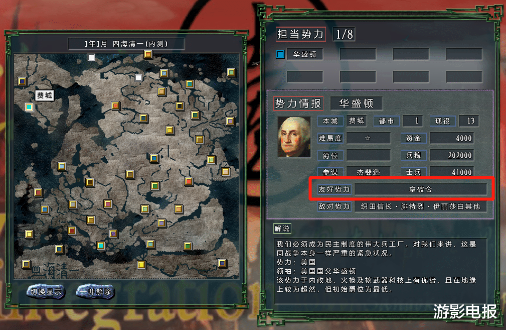 在游戏初始选择势力的界面的时候,选择美国之后,有一个非常重要的信息,就是友好势力有法国的拿破仑,他将成为美国最为倚重的盟友,并给到美国早期巨大的帮助。