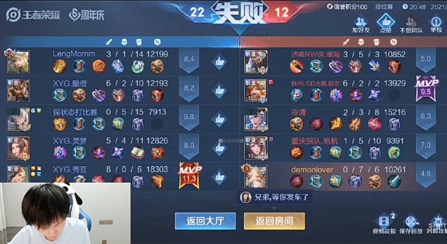 个人观点:从这局比赛就能看出,一支完整的职业战队,威力要大于不同战队选手组成的车队,Fly这边个人操作不输给XYG,但王者荣耀最考验的还是运营和配合,XYG展现出了强大的实力,难怪能在KPL中站稳脚跟。Fly这局的战绩虽然不好看,但意识极佳,用带线牵制的方式拖到了20分钟,只差一点点就能完成翻盘,他给粉丝贡献了一场精彩的撞车对局!