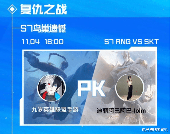 在11月4日下午16点整,上演九岁vs迪丽阿巴阿巴,对应的是S7中RNG与SKT的对决;九岁是目前ks英雄联盟手游专区主播当中粉丝数量最多的一位,而迪丽阿巴阿巴则是英雄联盟手游专区当中的女神级别主播。后续在11月5日16点整,将会上演魅儿与鬼索的对决,这其中一个是腿游的代表,一个则是峡谷绝活哥。两位即将重现的对局是中国赛区连续两年夺冠的阵容!