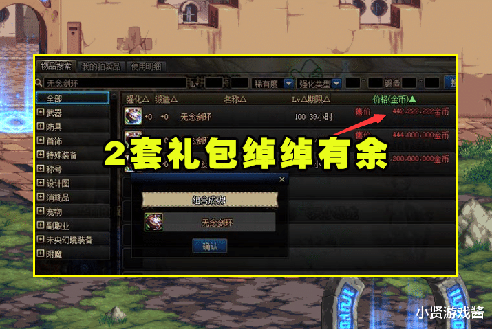 面对无念剑环、灵魂掠夺者这2张设计图,相信大家会优先选择无念剑环合,毕竟灵魂掠夺者更贵一些,但是这位欧皇却不走寻常路,第一发不是优先合无念剑环,而是灵魂掠夺者,可惜失败了,直接损失了8个亿。不过好在第2发合无念剑环的时候成功了,过程有惊无险,直接赚了4.4亿金币,美滋滋!以目前1:60的金币比例计算,相当于770块钱,买2套金秋礼包都绰绰有余了。
