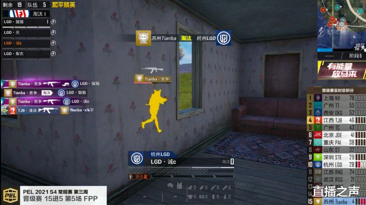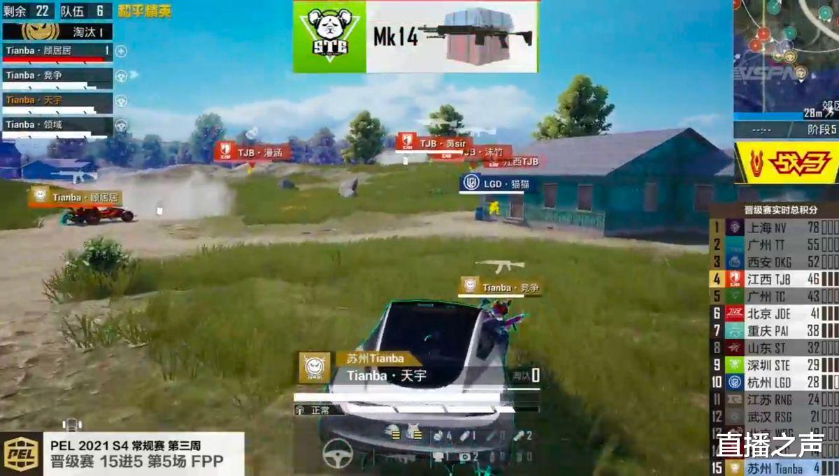 天霸刚好就在房区内部并没有管旁边的RSG,但是桥对面就是WBG与JDE,天霸只有等这波大减员之后再进圈,天霸左边就有五支队伍展开混战,天霸本想坐收渔翁之利但是今天的枪法确实有些失误没有拿到人头,来到阶段五天霸里面开车想要扎进圈中心的房区,里面有LGD的成员,天霸的竞争非常帅气地来了一波从天而降,汽车还没有停稳竞争就跳下车的同时开枪击倒LGD一名成员,随着队友的跟进将其带走,无奈后面PAI黄雀在后将天霸带走位列第五淘汰。
