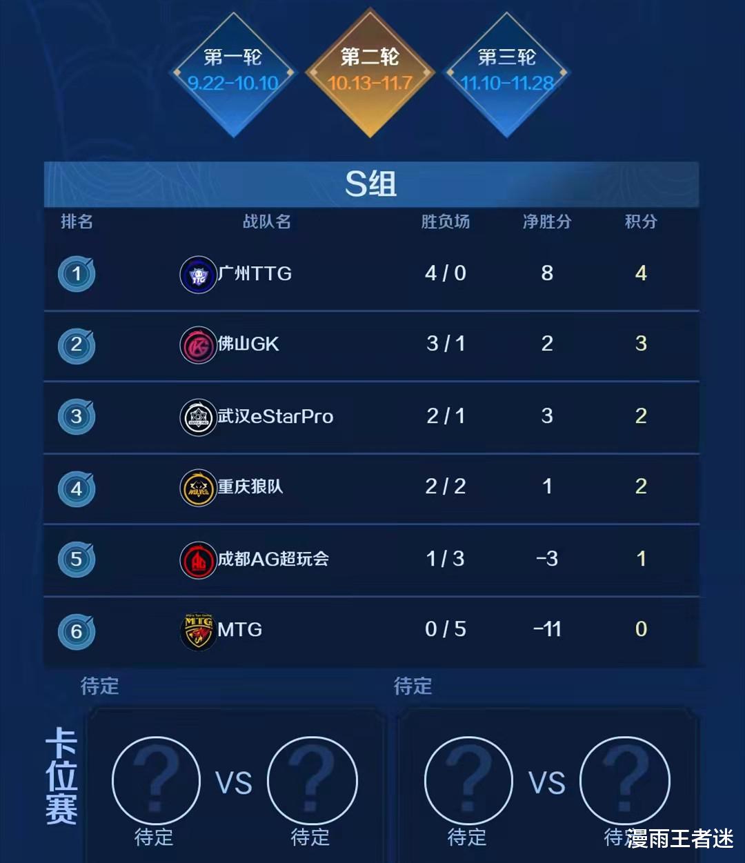 2021年KPL秋季赛常规赛第7周第3个比赛日的第1场比赛,结果已经尘埃落定了。而最终的比赛结果是:TTG以3比0的比分战胜MTG,豪取5连胜(常规赛第1轮的收官之战加上常规赛第2轮的前4场比赛)。这一战过后,MTG已经确定要以S组第6的身份进入S组卡位赛。也就是说,TES的卡位赛对手已经确定是MTG了。