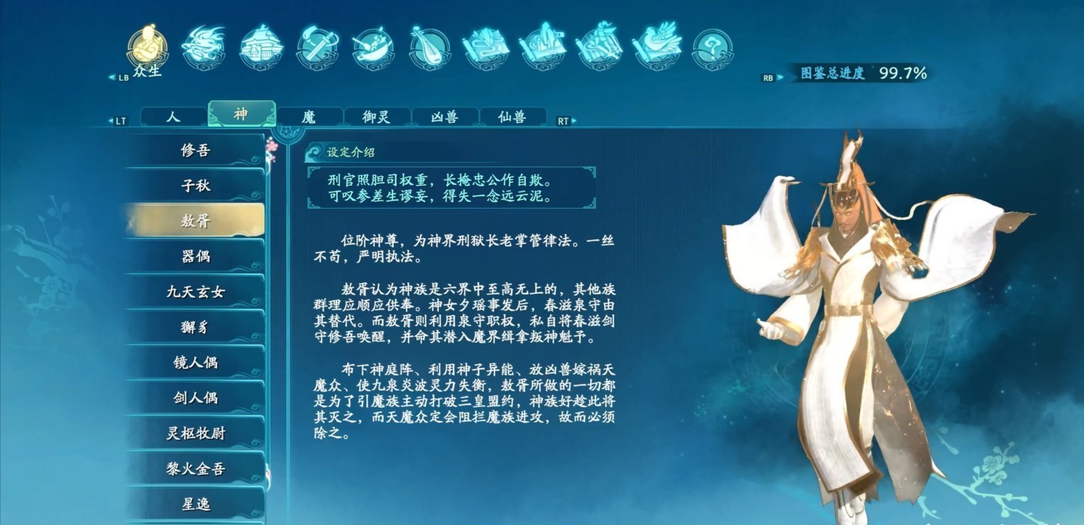 敖胥是伏羲所创造的初代神之一,在新设定中伏羲创造初代神之时自身灵力最为强大而天地间的灵力也最为优质,因此初代神的实力要强于后来以神树果实注入伏羲的精力创造出的二代神。神界自天帝之下,从高到低分为长老、天尊、上神、普通神族,其中初代神皆为长老与天尊,新神最高为上神,敖胥曾属于神界长老团的一员,虽然因为犯错给降了一级,但毋庸置疑的,敖胥是神界现存最高位神之一,而敖胥的神职是负责刑狱,加上他这金光闪闪的造型,很容易想到,他的原型应该是来自中国神话中的金神蓐收,只不过蓐收直接当boss可能节奏比较大,所以原创了敖胥这个名字。而敖胥初代神的这个定位,在仙剑这个神魔作为六界顶端的世界观下,定位就已经远远压过仙二、仙三外传、仙四、仙五、五前的所有boss了。