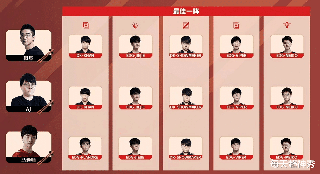 当然,关注着S11决赛的观众除了粉丝,还有LPL职业选手、退役选手,谁能组成决赛第一阵容?前RNG、EDG队员AJ力挺汉子哥Khan:Khan要比圣枪哥厉害,不只打得稳,英雄池也很深,圣枪哥有些操作“莫名其妙”。他给出的第一阵容由Khan、Jiejie、ShowMaker、Viper、Meiko组成。
