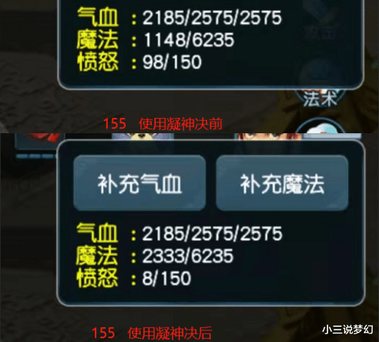 在梦幻中有很多的玩家会选择使用凝神决来恢复角色的蓝量,但是大家知道凝神诀恢复的蓝量数值是的多少?,上面是一个155级法系的角色,这位玩家对比了使用前和使用之后的蓝量多少。凝神诀大约恢复了1000多点蓝量,小编感觉凝神决恢复的蓝量应该根据蓝量的上限吧,蓝量上限越高,恢复的蓝量越多。